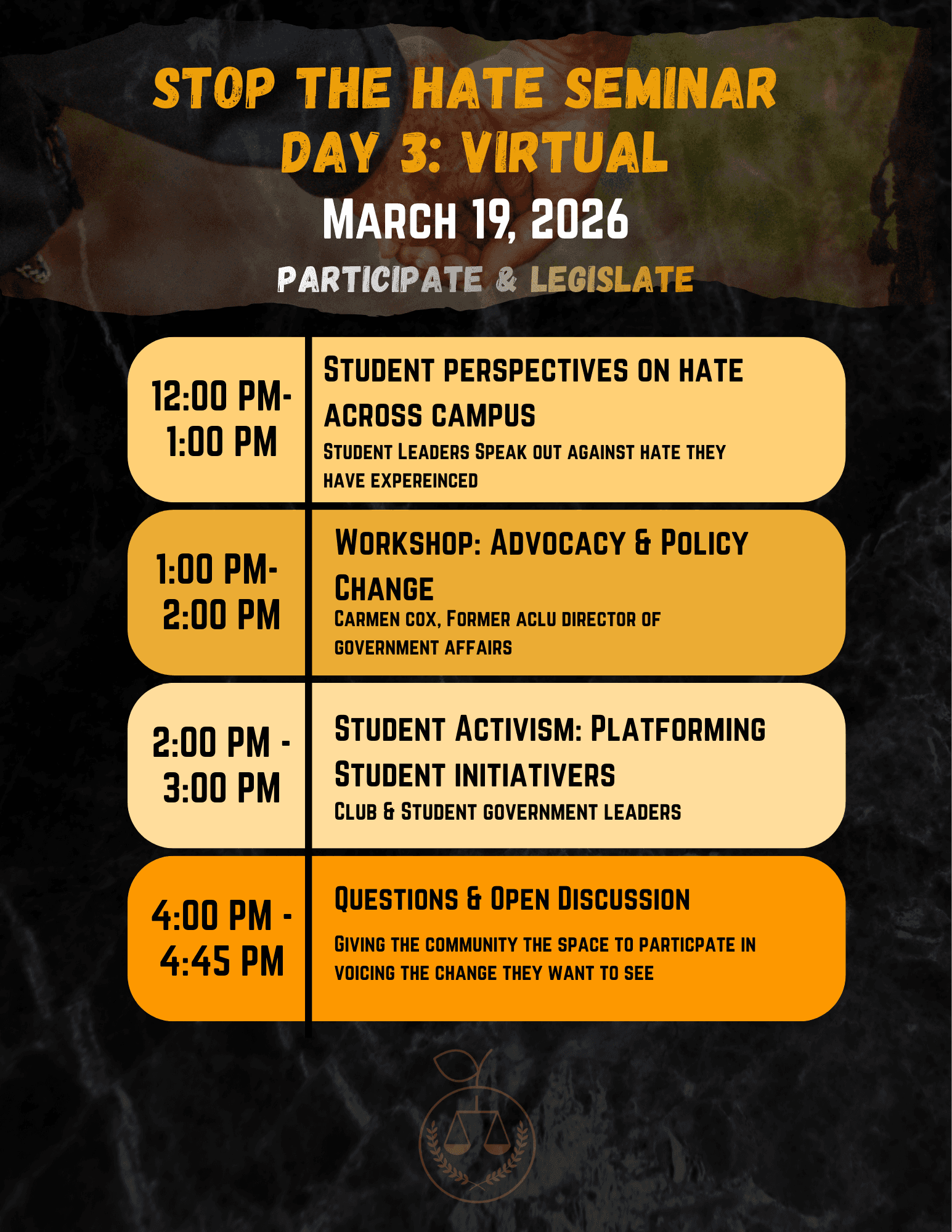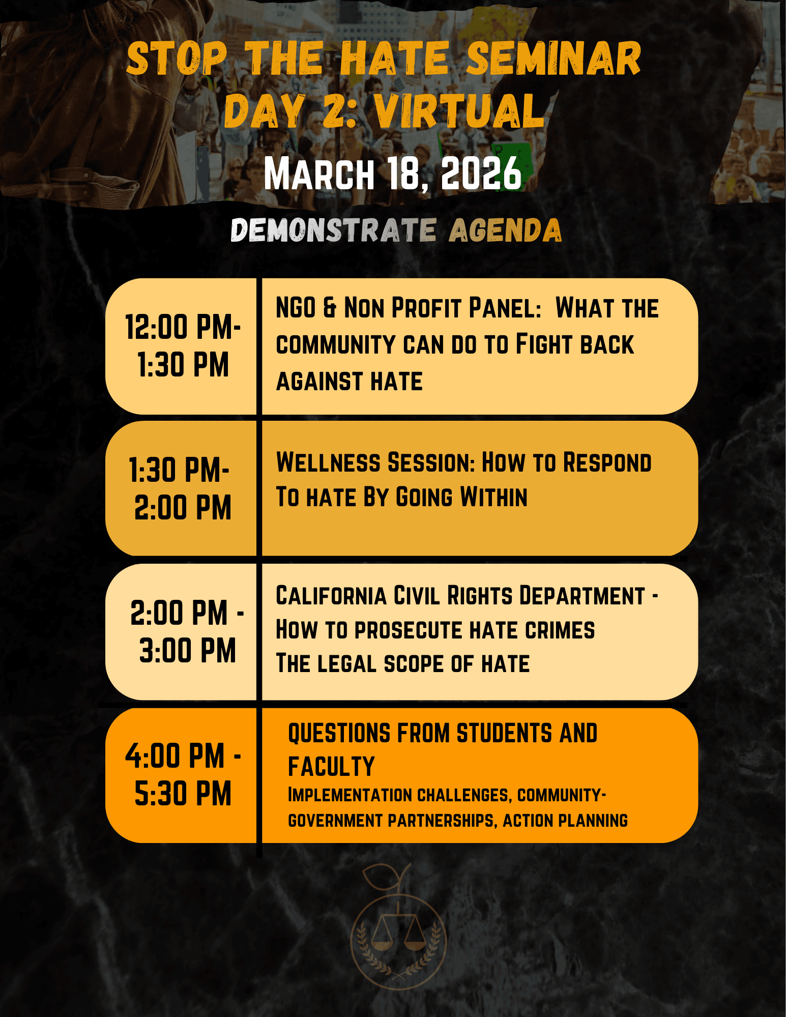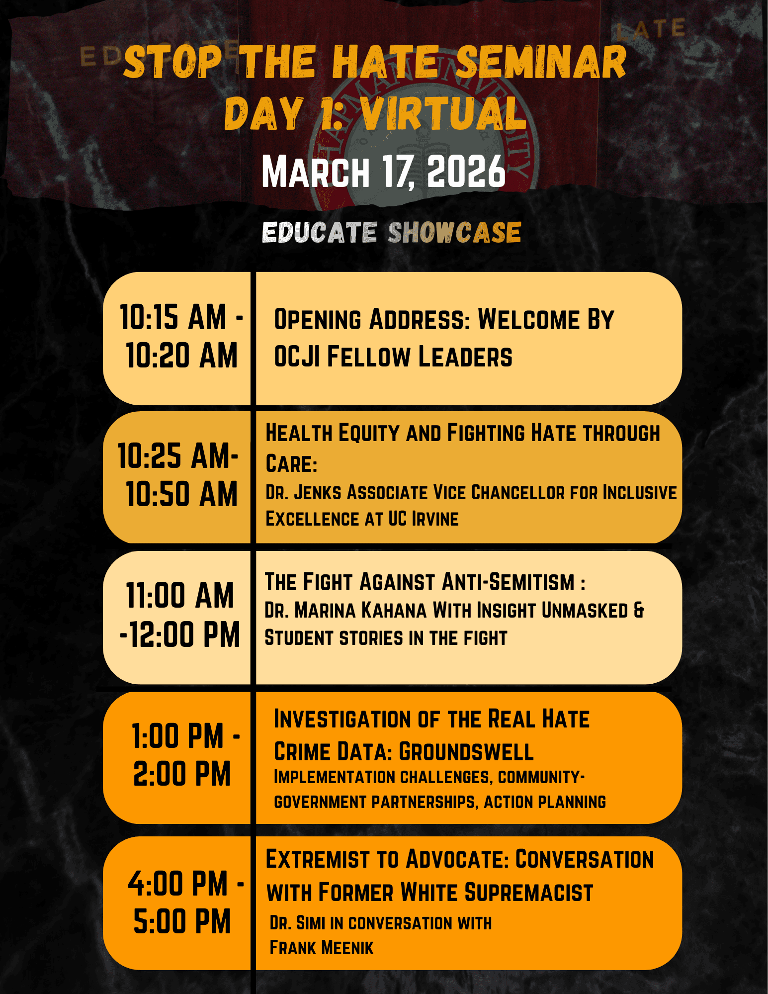 Please check out the 3 day agenda for OCJI Stop The Hate Seminar. Thank you to all the organizations particpating,